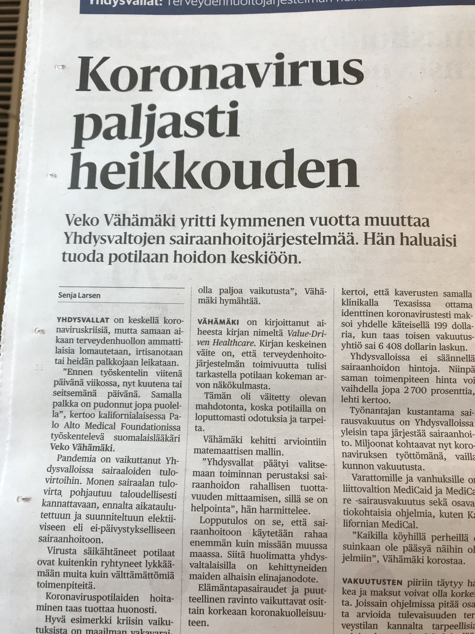 Aki Linden على تويتر Hs 13 7 A 18 19 Erittain Hyva Senja Larsenin Artikkeli Usan Terveydenhuoltojarjestelmasta Ja Koronaepidemia Suomen Uudistuksia Tehtaessa Pitaa Valttaa Nama Virheet Paineita Businessvetoiseen Terveydenhuoltoon On Meillakin